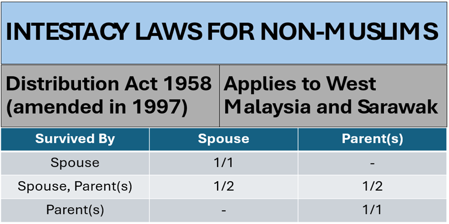 Without a Will, all the deceased’s estate will be distributed according to the Distribution Act 1958 (applicable to West Malaysia and Sarawak) or Intestate Succession Ordinance 1960 (applicable to Sabah).